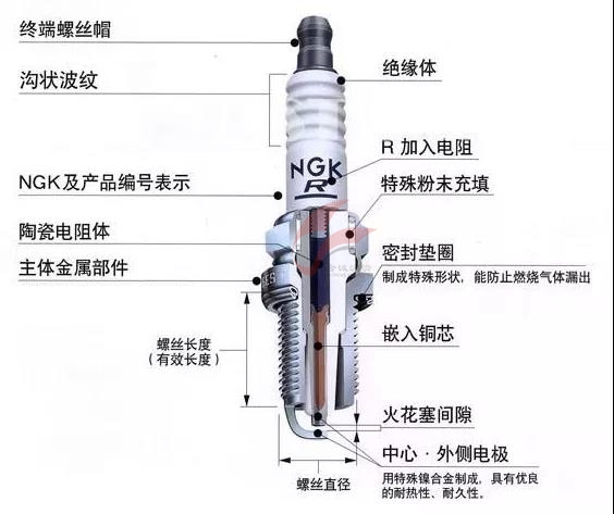 结构并不复杂,用途单一。汽油机点火系统中将高压电流引入气缸产生电火花,以点燃可燃混合气体。火花塞由接线螺母(终端螺丝帽)、绝缘体、陶瓷电阻体、主体金属部件、中心电极、侧电极等部件组成,侧电极焊接在外壳上。
